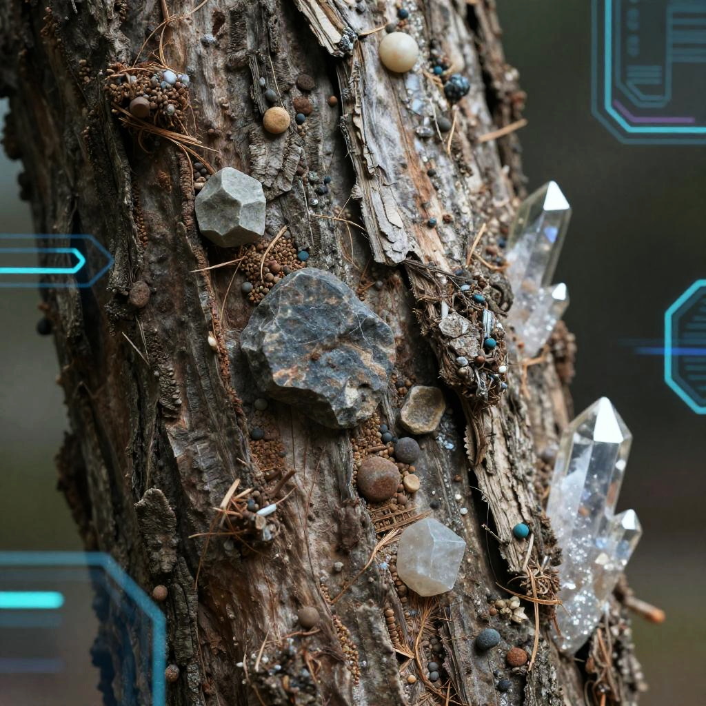 AI texture portraying a fusion of natural textures like bark, stone, and crystal with futuristic digital overlays and neon accents, blending organic depth and tech-inspired geometry in a detailed, high-res cyberpunk environment.
