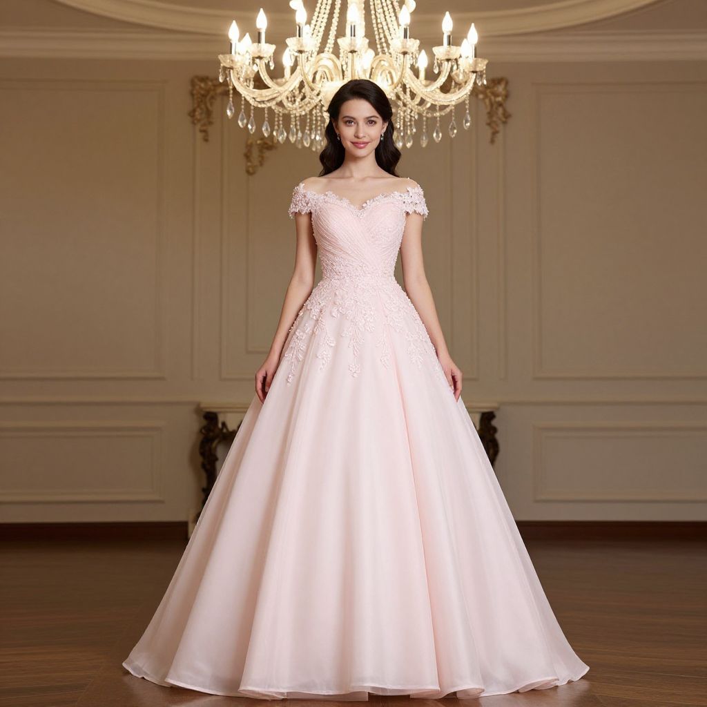 Gowns Wedding Costume, a woman in a pink dress standing in front of a chandelier