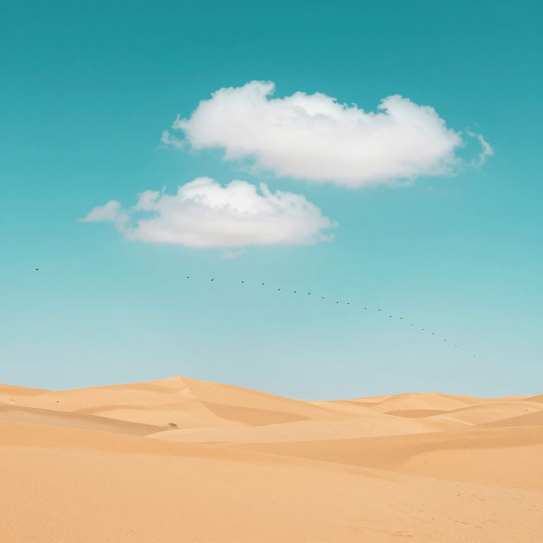 Sand dunes stretch endlessly under a vast turquoise sky, where a flock of birds ascends gracefully against the backdrop of fluffy white clouds, creating a serene contrast between earth and air.