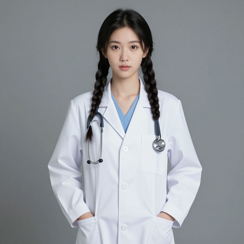 Photograph of an East Asian woman with long black hair in two braids, wearing a white lab coat over a light blue shirt, with a stethoscope hanging around her neck. She stands against a plain gray background, looking directly at the camera with a neutral expression. Her hands are in her coat pockets. The image has a realistic, studio-lit style, emphasizing her professional and calm demeanor. The lab coat is crisp and clean, and the stethoscope adds a medical professional context to her appearance.