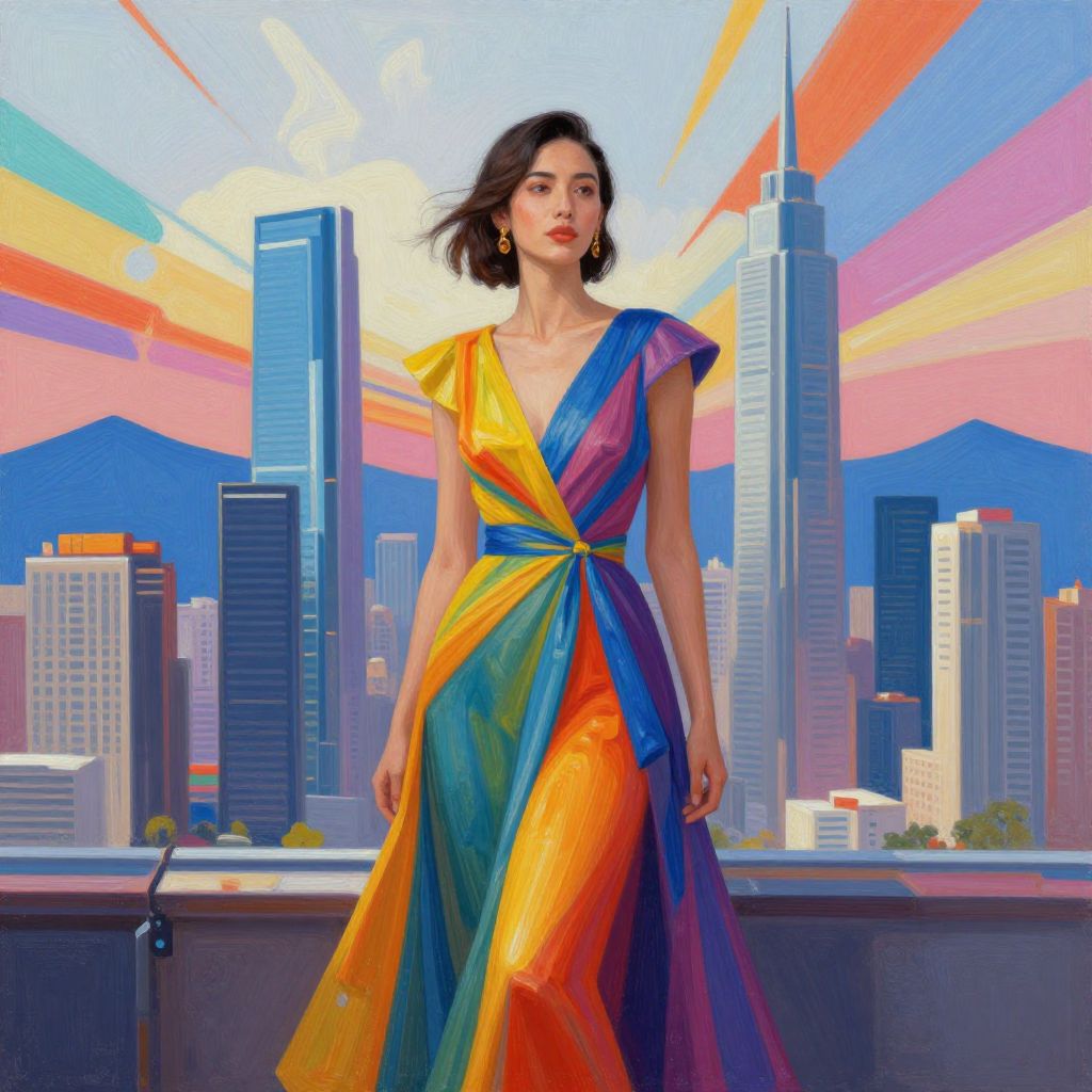 Digital art painting of an elegant woman wearing a vibrant multicolored dress standing in front of a futuristic city skyline with tall skyscrapers. The background features colorful abstract streaks across the sky and distant blue mountains, blending urban and natural elements in a surreal, modern style.