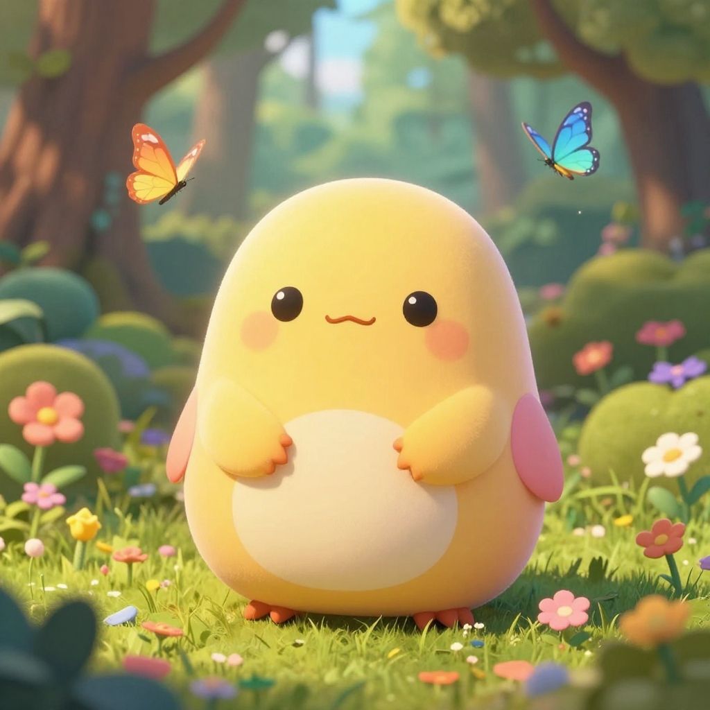 Blue character with glasses and a gentle smile, sitting in a park under cherry blossom trees, soft pastel colors, serene atmosphere, impressionistic art style