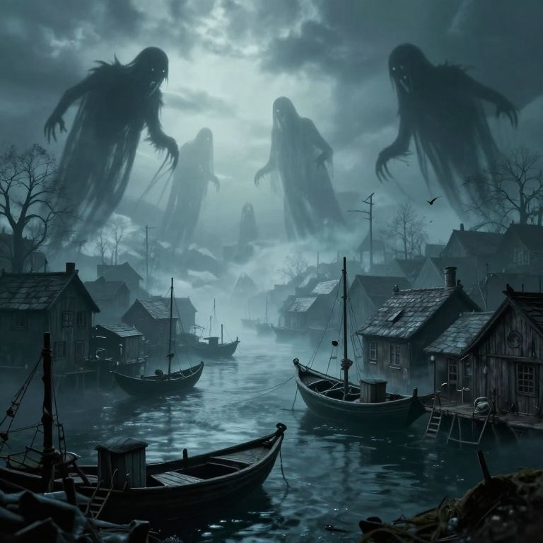 This is a digitally created, dark fantasy illustration of a foggy, deserted medieval street at night. The sky is overcast with dark, swirling clouds. Large, menacing, ghostly humanoid figures with gray, decaying skin, glowing red eyes, and sharp teeth loom above the street. Three of these creatures are prominently visible, with one much larger and more imposing in the center. The street is lined with old, stone buildings with wooden roofs and flickering street lamps. Small, shadowy figures of people in dark, medieval clothing walk along the cobblestone path, adding a sense of eerie atmosphere.