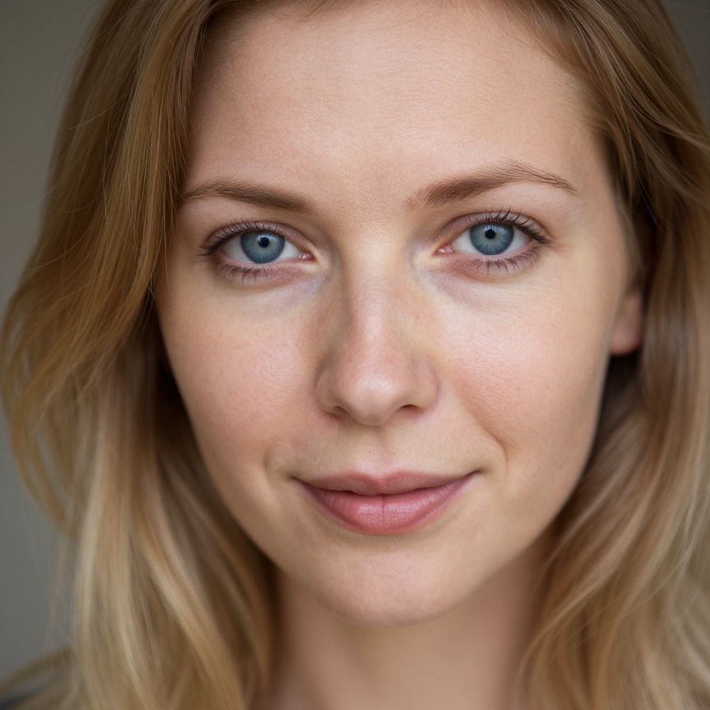 A digital camera captures a Slavic woman's piercing blue eyes and cascading golden hair with an unambiguous gaze. Her ageless visage, illuminated by soft light, exudes wisdom and mystery, accentuating coarse skin texture and natural imperfections. From above eye level, her full lips curve into a faint smile, revealing captivating warmth. The blurred background keeps the focus on her expressive features, inviting viewers to immerse themselves in this emotional gradient that transcends time.