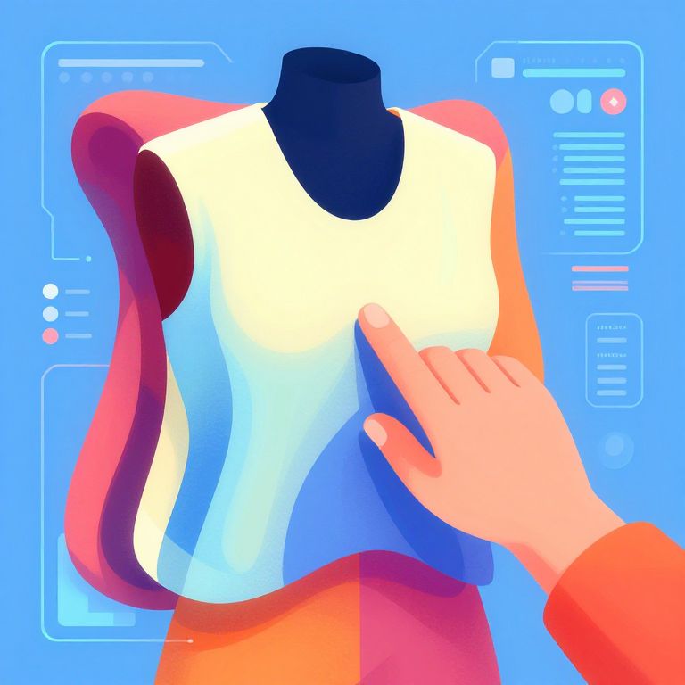 Digital illustration of a stylized, abstract mannequin bust on a bright blue background. The mannequin, with a black neck and no head, wears a sleeveless white top with a pink and orange gradient. A human hand with a light skin tone and orange sleeve is positioned on the right side, touching the mannequin's chest. The background features futuristic, tech-like interface elements in white, including circles, lines, and text boxes. The overall style is vibrant and modern, with bold colors and smooth, simplified shapes.
