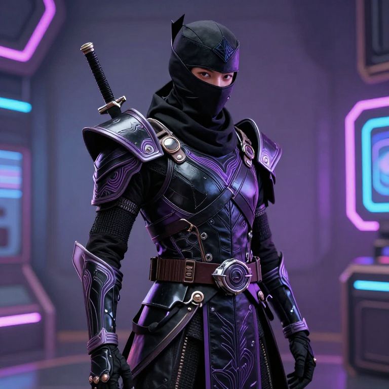 A futuristic ninja in black and purple armor with intricate designs and glowing accents stands in a retro sci-fi setting.