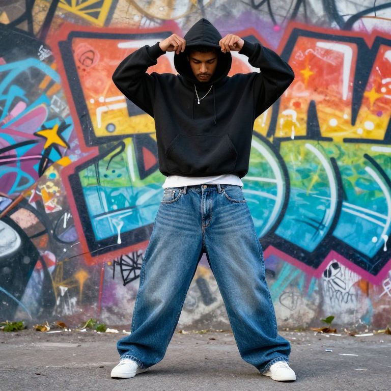 A person exhibiting hip-hop culture with a dynamic stance, dressed in a hoodie and baggy jeans, stands against a vibrant graffiti backdrop.