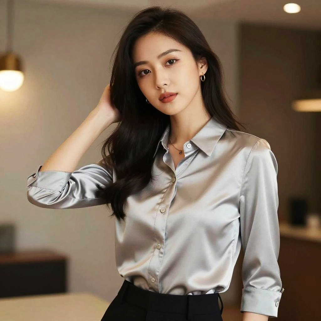 A stunning woman poses confidently in a sleek, silver blouse that highlights her elegance and poise. The soft lighting in the background adds a warm ambiance, making this image perfect for fashion or lifestyle themes.