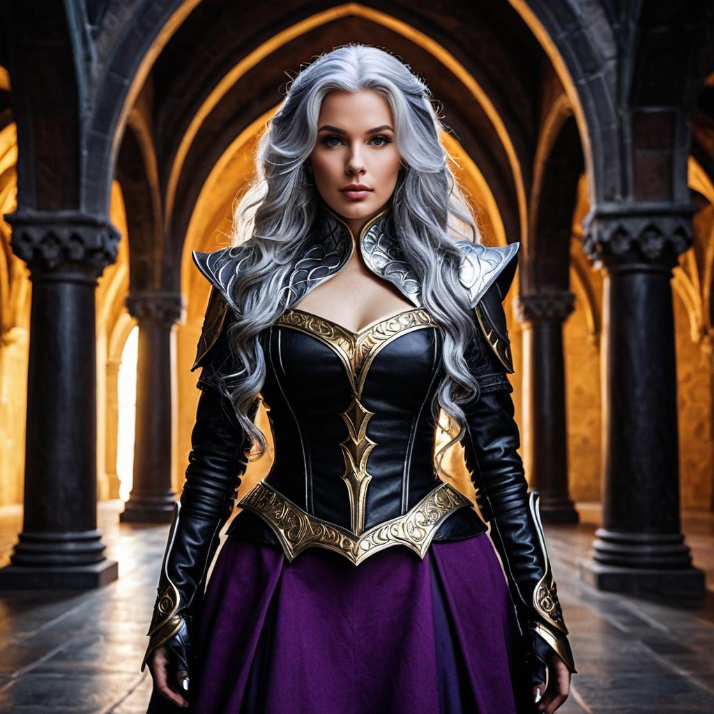 Ursula vanessa cosplay, digital art, realistic style, female character, long wavy silver hair, dark elf, black leather armor, gold trim, high collar, long sleeves, fitted bodice, purple skirt, serious expression, detailed background, medieval architecture, warm lighting, elegant, fantasy genre, symmetrical composition, highly detailed hair and clothing ures, portrait orientation, slightly frontal view