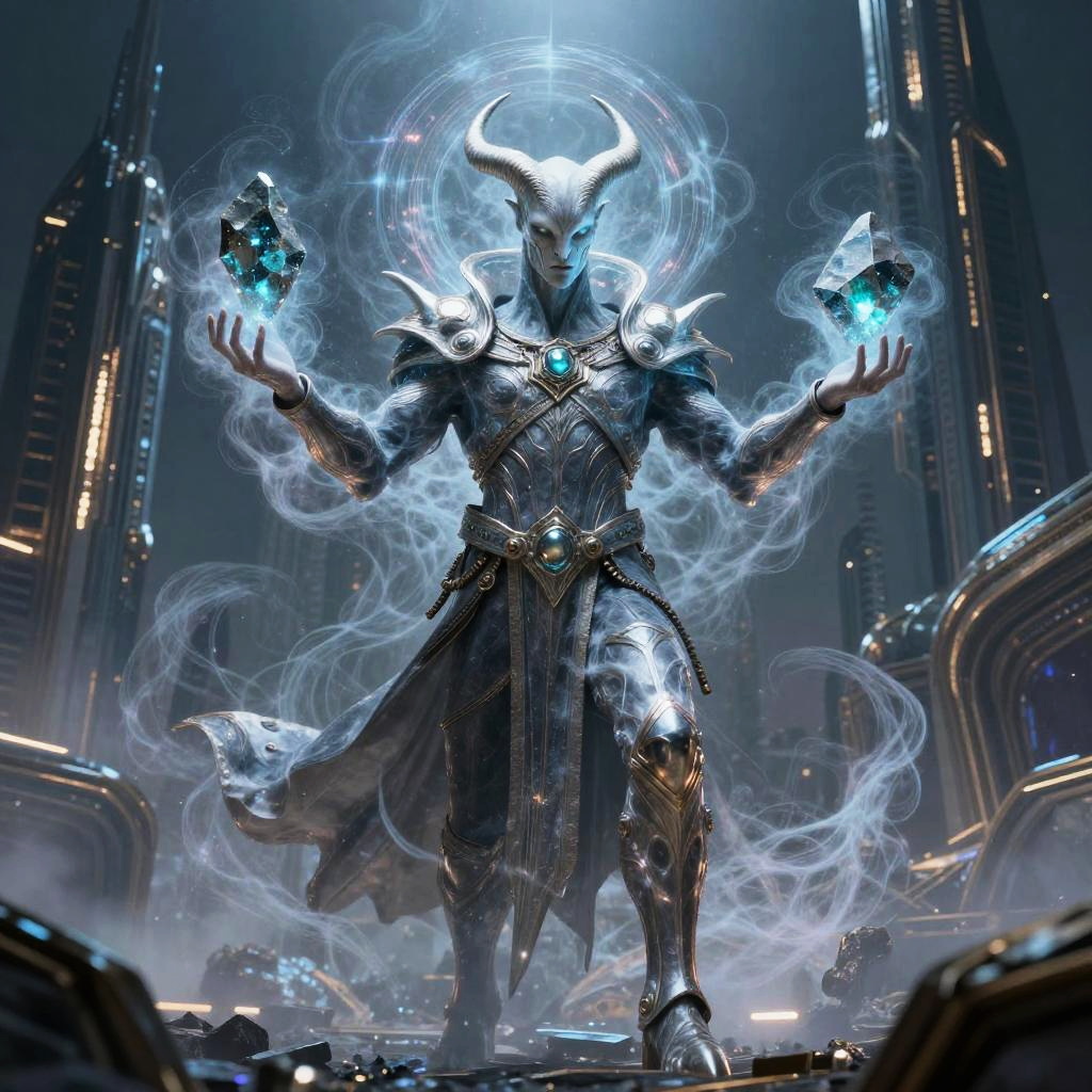Digital artwork of a powerful, horned, armored figure with glowing blue magic orbs, standing in a futuristic, metallic cityscape.