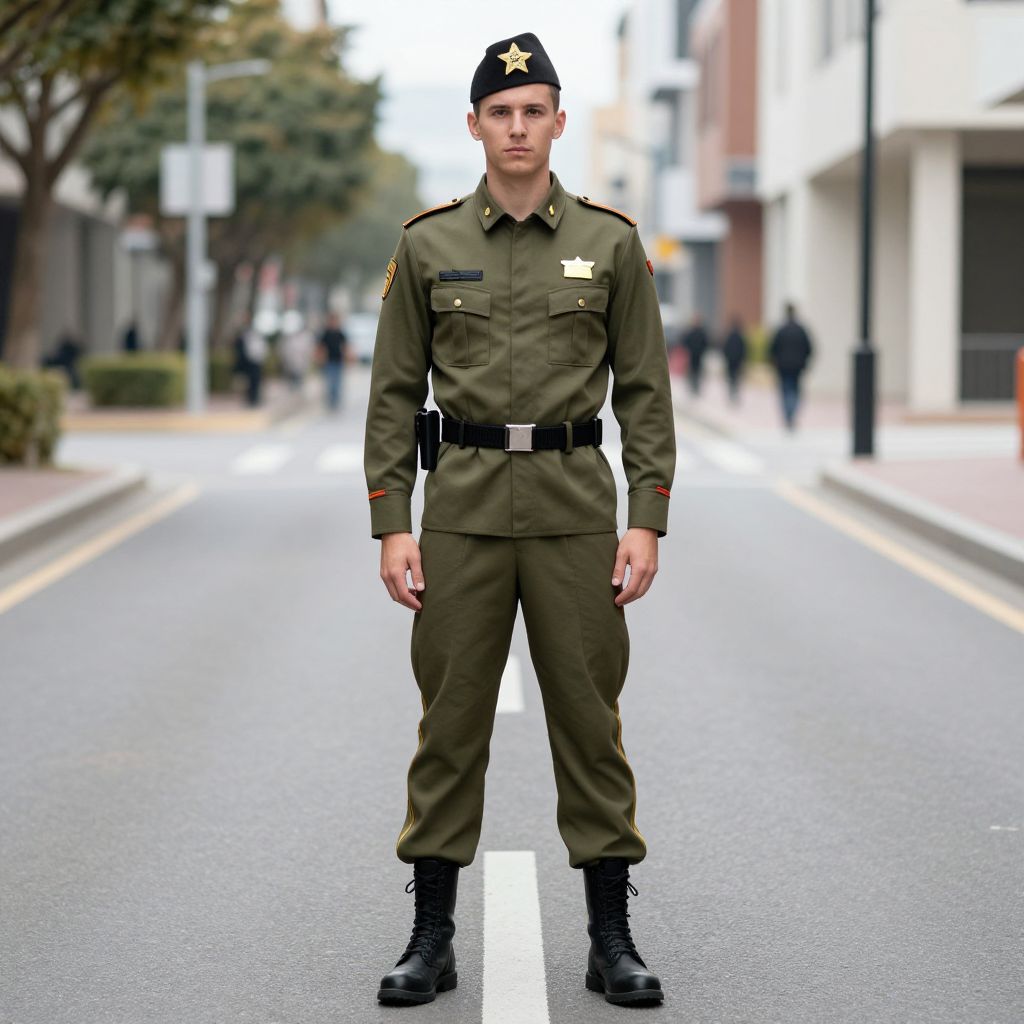 Photograph of a young, Asian male soldier standing in the middle of a blurred, urban street. He has a serious expression, short black hair, and wears an olive green military uniform with a black beret, black belt, and black boots. The uniform has several patches, including a national flag on the left chest and a white star on the beret. The street has yellow lines and trees on both sides, with blurred buildings and people in the background. The image has a realistic, slightly over-saturated style.