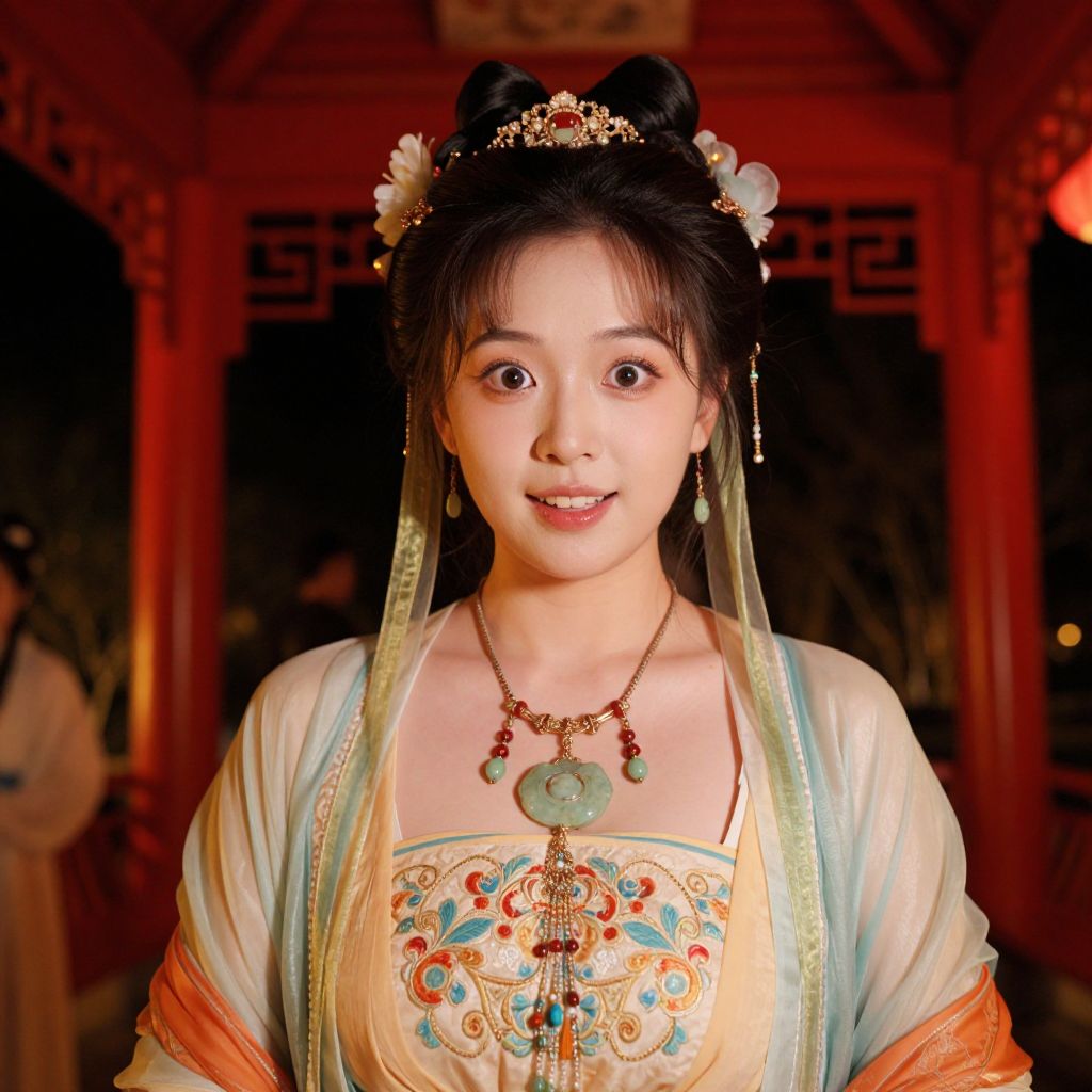 A close-up portrait of a young woman in a traditional Chinese fairy costume, including a delicate jade neckpiece and layered flowing sleeves, standing in the middle of a red-dyed pavilion during a cultural performance at night, her face glowing with warm, soft light and wide, expressive eyes that reflect joy and mystery.. The woman has big tits and cute face