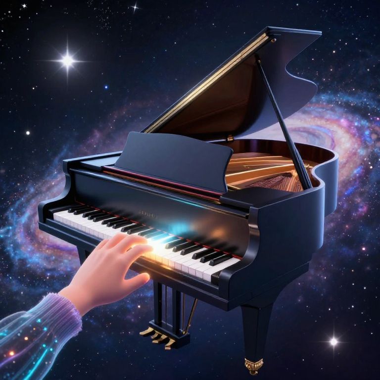 Digital art of a hand playing a glossy black grand piano amidst a cosmic background with colorful nebulae and stars.