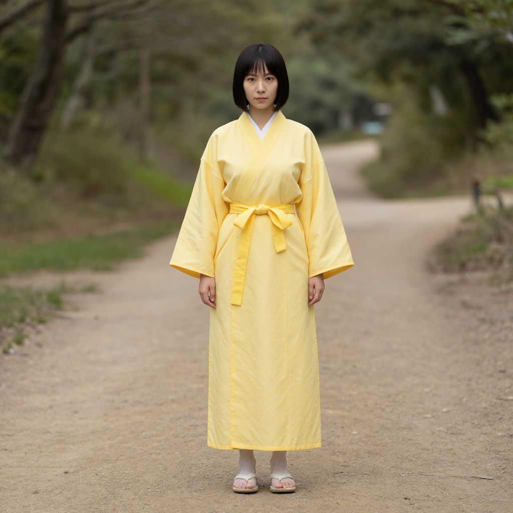 Photograph of an Asian woman with a bob haircut, wearing a bright yellow kimono and white sandals, standing on a forest path.