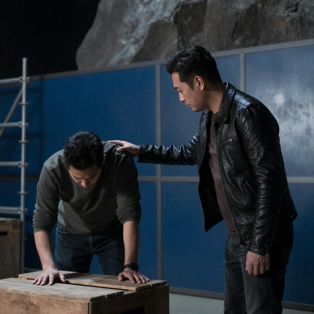 Photograph of two men in a dimly lit, industrial setting with blue metal panels and scaffolding. The man on the right, with dark hair and a black leather jacket, leans forward, placing his hand on the shoulder of the man on the left, who is bent over a wooden crate. The background includes a large, rough-ured rock formation.