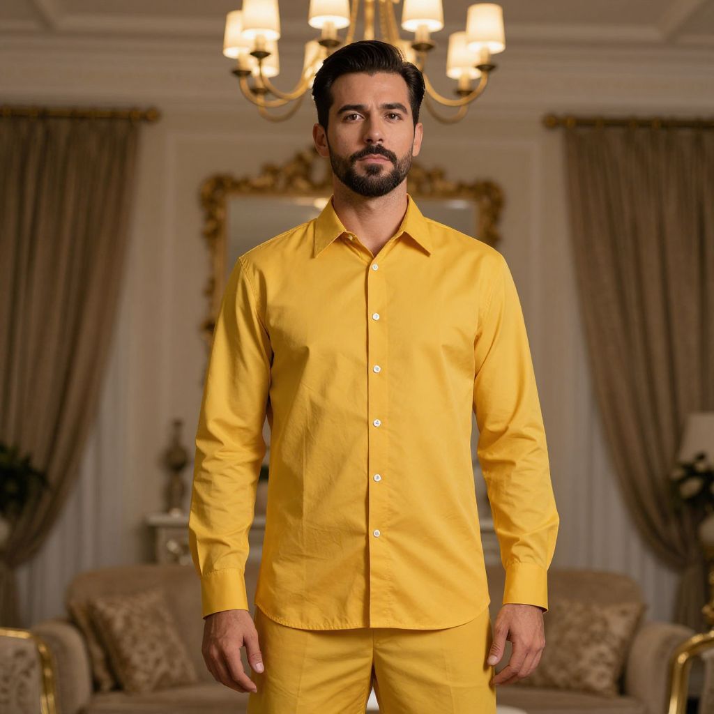 Mustard Shirt Costume, man in yellow outfit standing in a room with a chandelier
