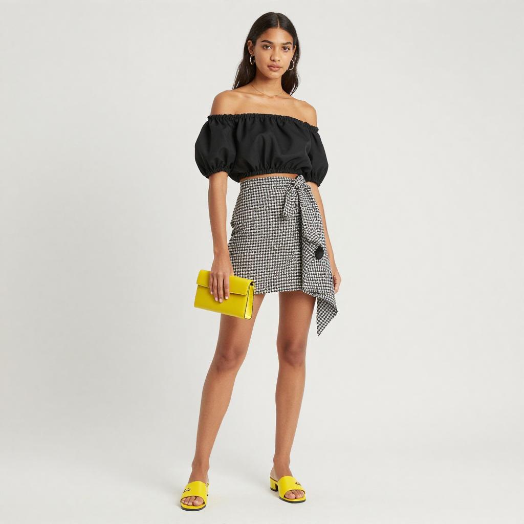 Full-length portrait of a young woman wearing a black off-the-shoulder crop top with puff sleeves, a houndstooth patterned wrap mini skirt with an asymmetrical hem, and yellow slide sandals. She holds a matching yellow clutch and stands against a white backdrop. The fashion style is modern and trendy.
