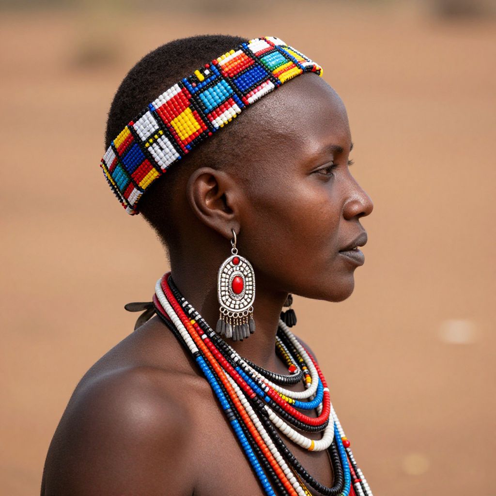 Photograph of a dark-skinned African woman with short hair adorned with a colorful checkered headband, wearing intricate bead necklaces and large circular earrings