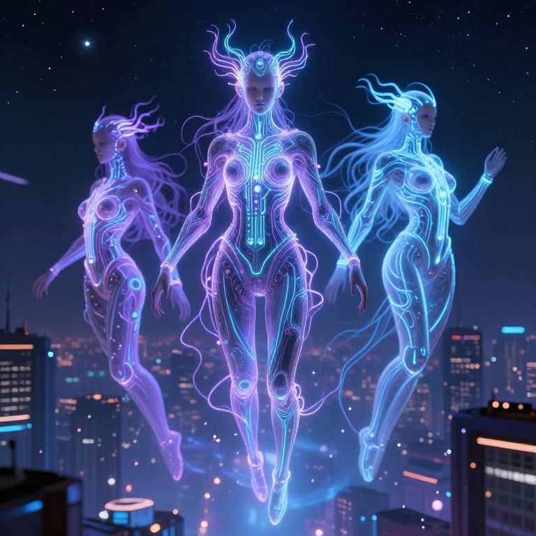 Deitys as futuristic cybernetic beings, glowing neon circuits intertwined with organic forms, hovering above futuristic cityscapes under starry night, a mix of technology and divinity, neon blues and purples dominate, dynamic composition with a sci-fi fantasy fusion aesthetic