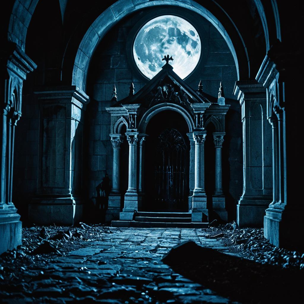 Vampires A cinematic, hyper-realistic scene of an ornate vampire crypt bathed in moonlight, real colors, real contrast, cold shadows, captured using an 100mm lens, f 2.8 aperture. Extreme detail and professional cinematic quality, emotionally charged visual style.