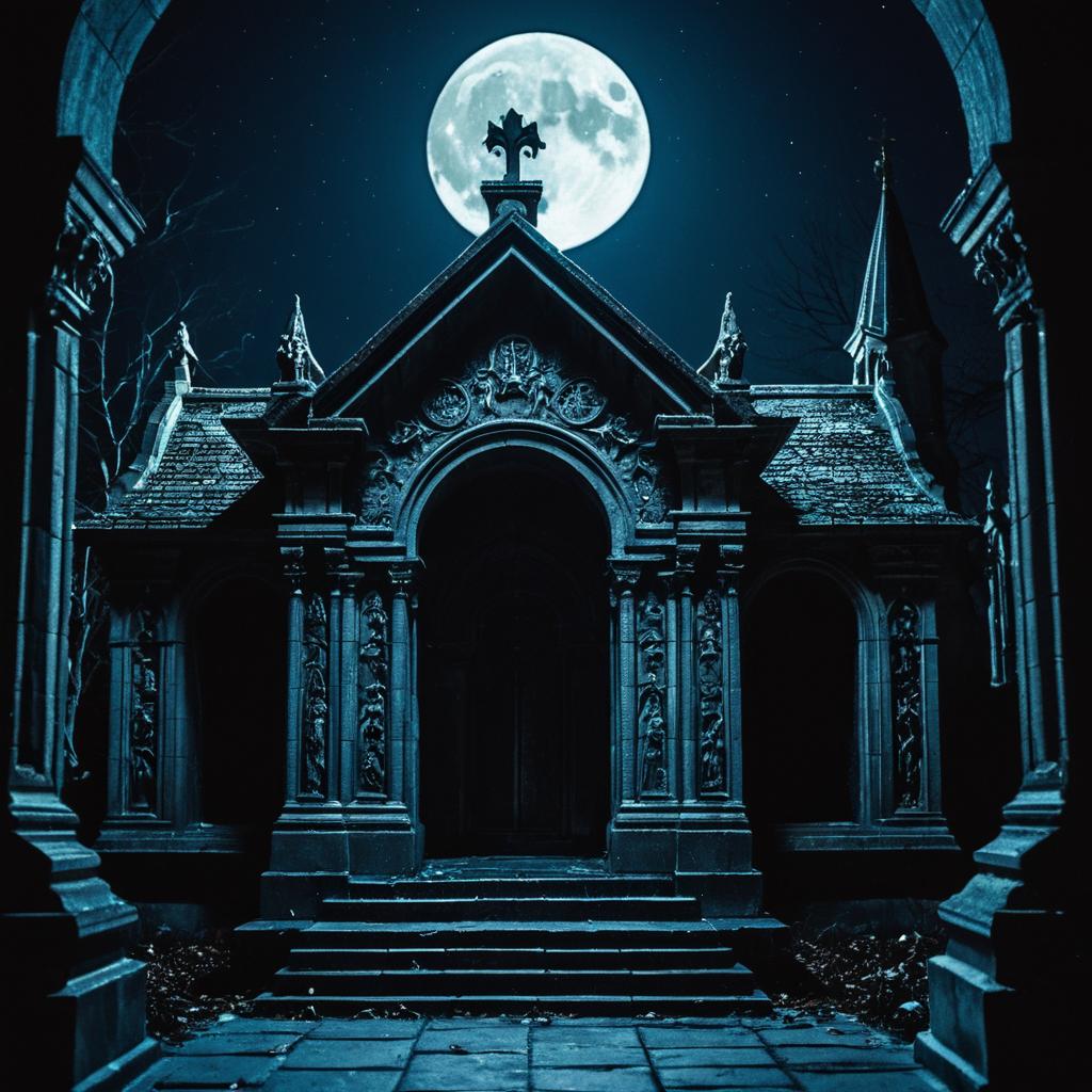 A hyper-realistic cinematic view of an ornate vampire crypt illuminated by moonlight during the night. The crypt features intricate gothic architectural details, stone stairs, and sculptural decorations. The scene is framed by stone arches with cold shadows and a large full moon in the background, emphasizing an eerie and dramatic atmosphere.
