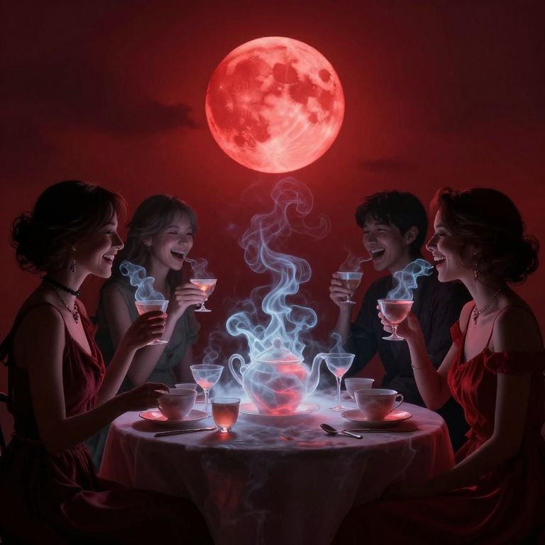 Under a crimson sky illuminated by a blood-red moon, a surreal tea party unfolds, featuring ethereal guests crafted from smoke and shadow, sipping from translucent crockery that dissolves into cascades of laughter, captured in a hauntingly atmospheric digital art style.