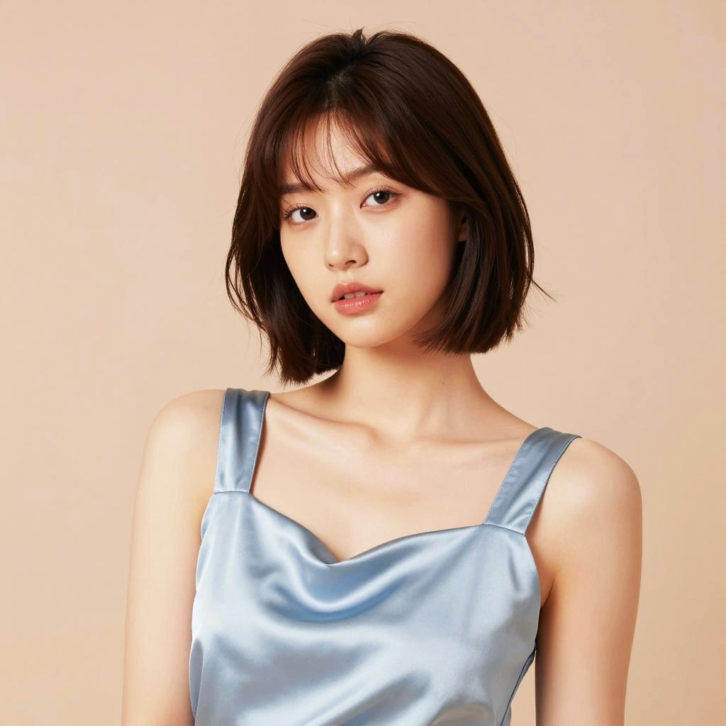 A young woman with a stylish bob haircut poses against a soft peach background, wearing a sleek light blue satin sleeveless top. The image captures a modern and elegant portrait with warm, natural lighting that highlights her delicate features and smooth skin.