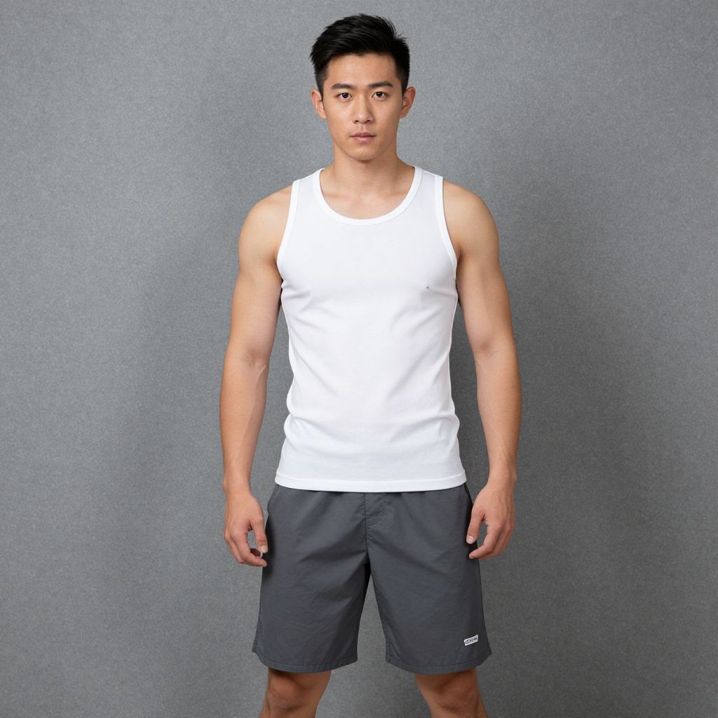 Photograph of a young Asian man standing against a plain gray textured background. He has short black hair, a fair to medium skin tone, and a lean, muscular build. He is wearing a white sleeveless tank top that fits snugly, and dark gray athletic shorts with a small white logo on the left side. His arms are relaxed by his sides, and he has a neutral, slightly serious expression on his face. The lighting is even, highlighting his athletic physique. The image has a realistic style with a slight digital enhancement, emphasizing his toned muscles and clean, minimalistic outfit.