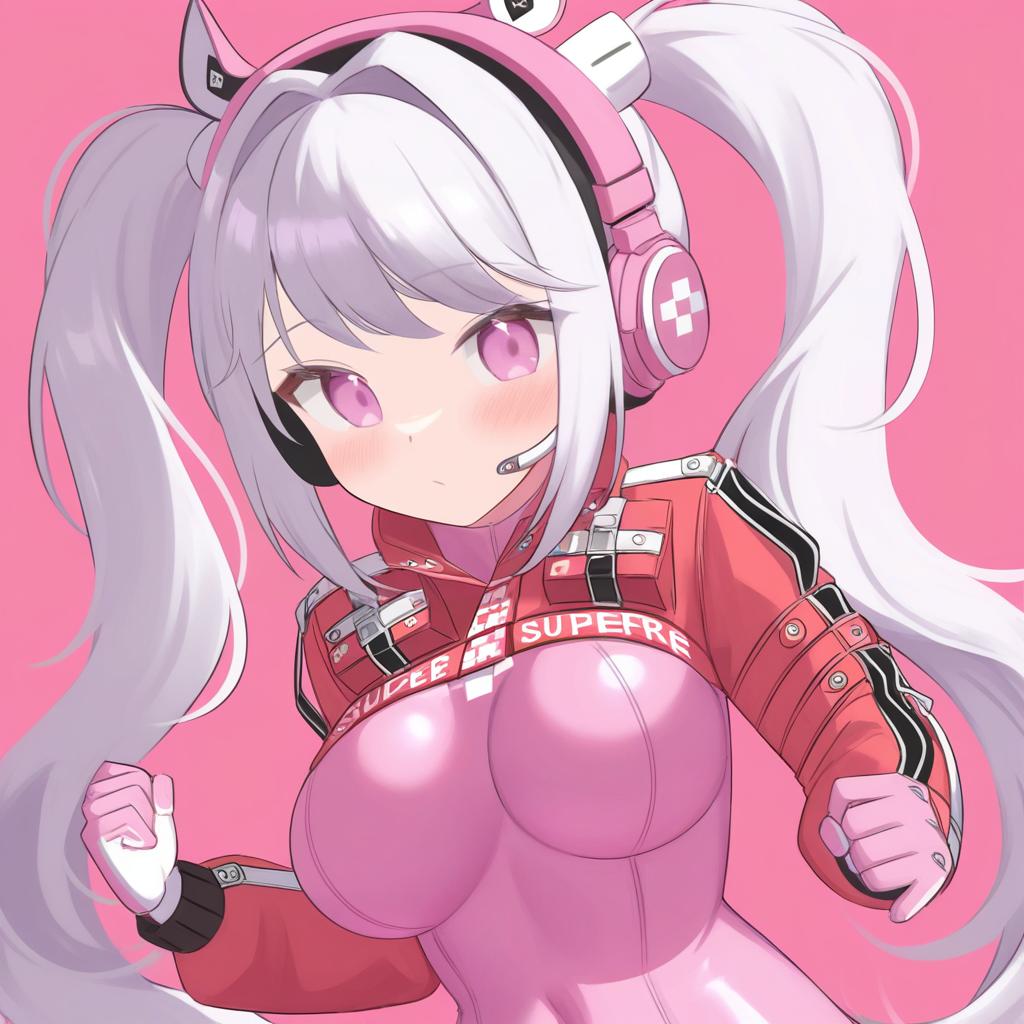 Alice (nikke), goddess of victory: nikke, 1girl, skin tight, animal ear headphones, pink eyes, long hair, pink hair, grey hair, white hair, twintails, sidelocks, medium breasts, large breasts, covered navel, pink bodysuit, pink gloves, cropped jacket, latex bodysuit, impossible bodysuit, red jacket, pink headphones, shrug (clothing), two-tone gloves, long sleeves, headset, by artist klaius, leet