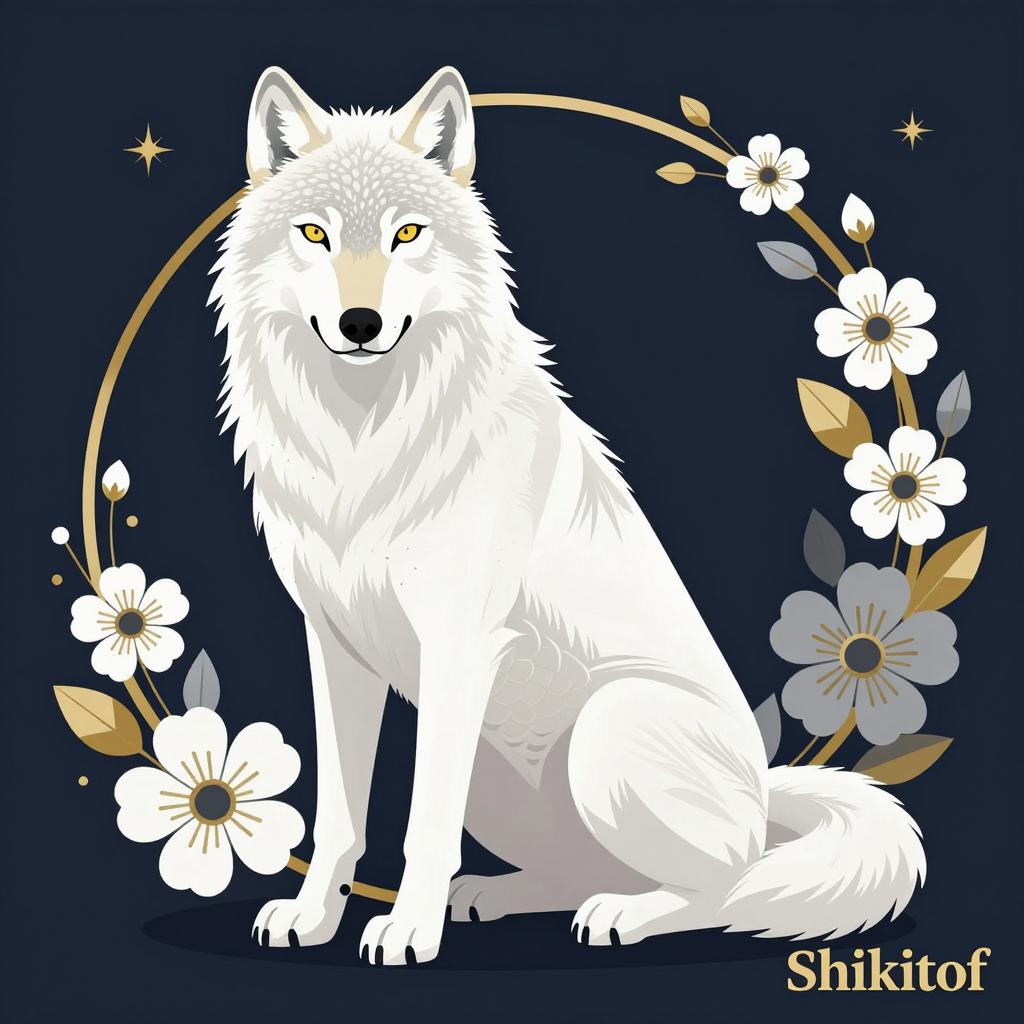 Illustration of two white wolves with intricate black and white fur. Top wolf has intense gaze, ears pointed, snout elongated. Bottom wolf looks upward, eyes partially closed. Wolves intertwined, surrounded by flowing fur. Dark red background. Artist's "@Shikitori" in bottom left corner.