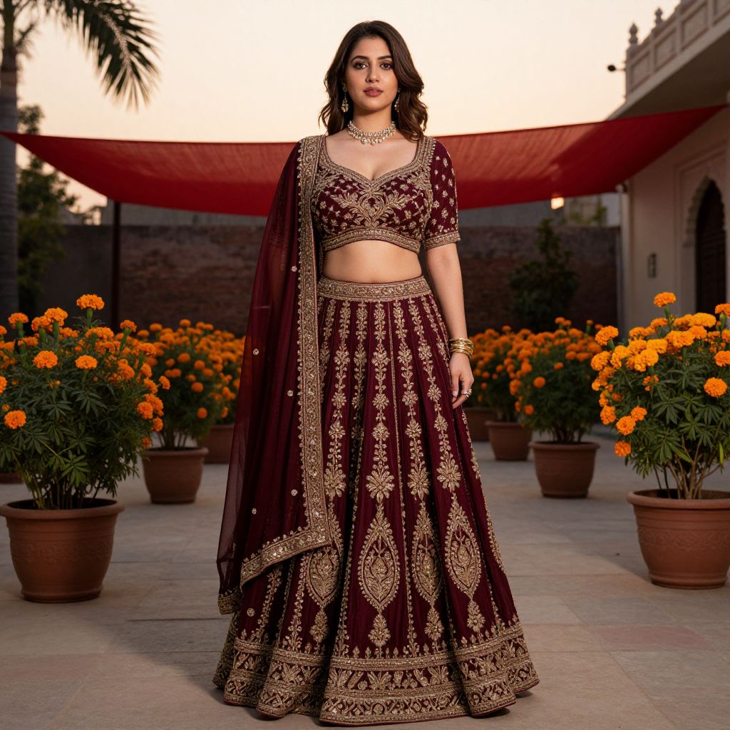 A stunning woman in her late 20s with warm brown eyes, full lips, and soft brown hair wearing a beautifully detailed burgundy color lehenga crafted with gold zari embroidery, standing in a traditional Indian courtyard at sunset, with flowering marigold plants and a red canopy in the background, the costume highlights the rich, deep burgundy hue that flows elegantly from her waist to the floor.. The woman has big tits and cute face