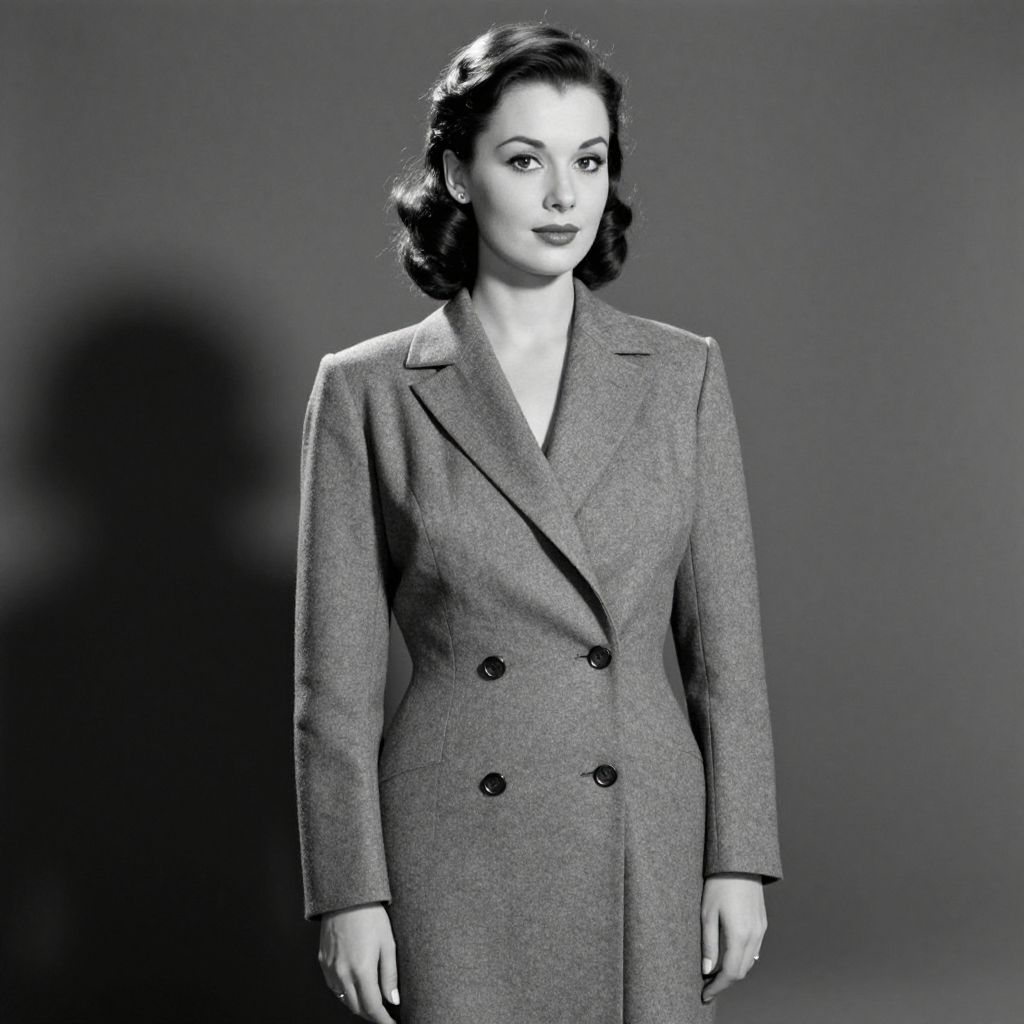 A vintage black-and-white photograph captures a woman elegantly dressed in a double-breasted grey suit, exuding a classic and timeless style reminiscent of mid-20th century fashion, with dramatic lighting accentuating her poised stance and confident demeanor.