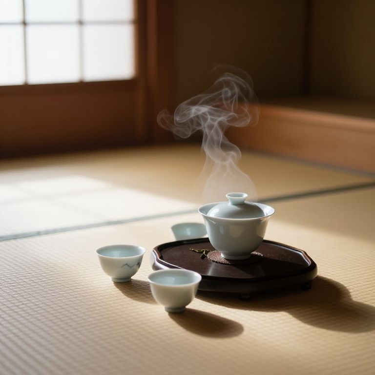 Aromatic tea ceremony in a serene Japanese tea house, steam rising delicately from porcelain cups, minimalist wooden interiors with tatami mats, soft natural light casting gentle shadows, peaceful and contemplative mood, intricate details on tea set and leaves