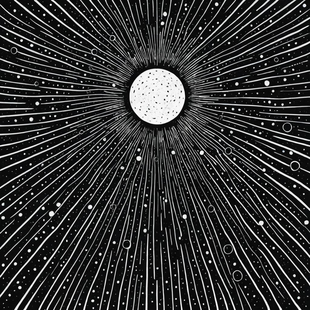 A graphic design illustration depicting a cosmic void with a central white sphere surrounded by radiating white lines and scattered dots on a black background. The design features bold, simple forms evoking a melancholic and mysterious cosmic horror theme, rendered in a style reminiscent of artists like Junji Ito and Dan Lee.