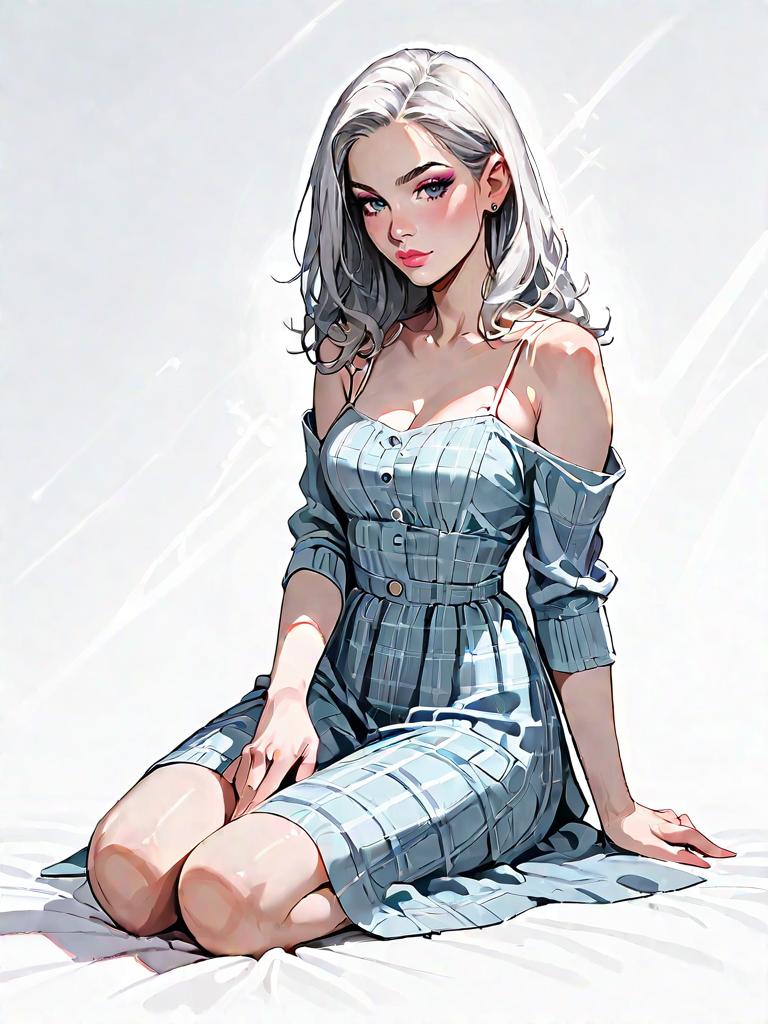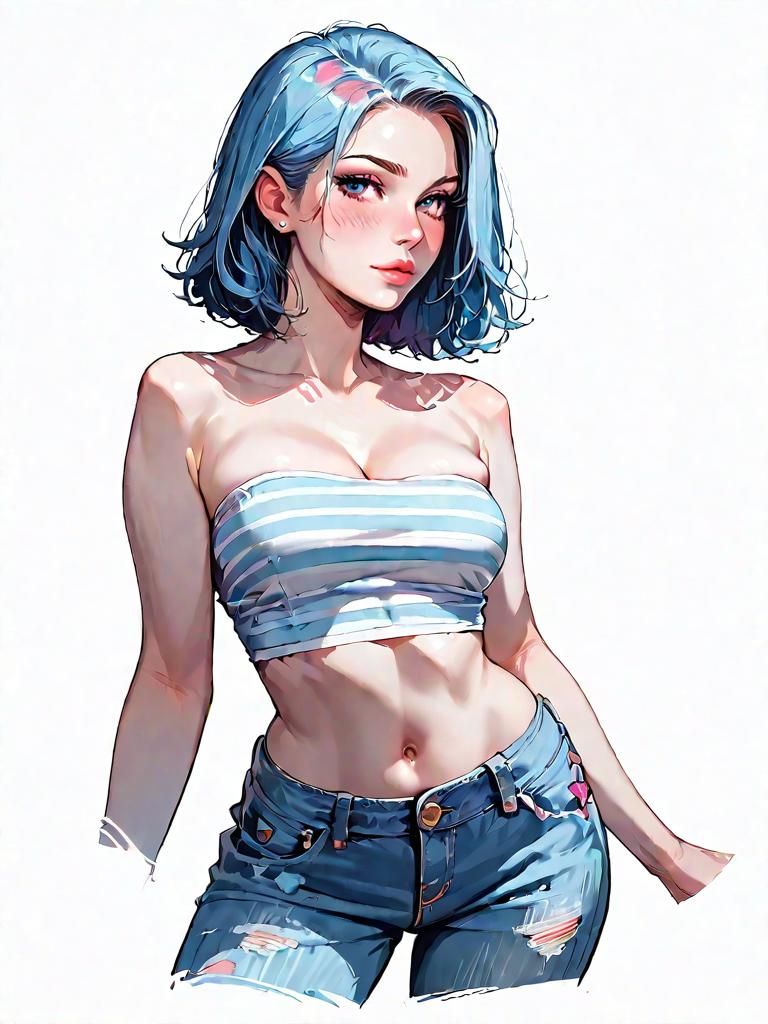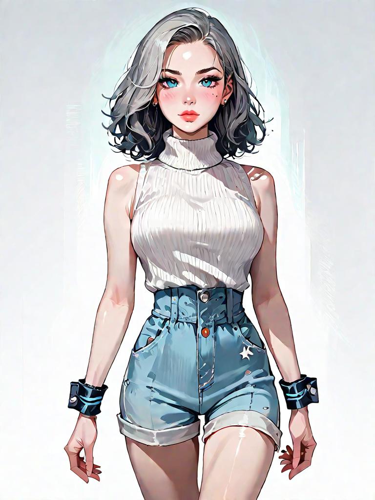 1girl, source_comics, realistic face, full body shot, Woman, contemporary casual, cropped black ribbed t-shirt, hook-and-eye front closure, short sleeves, high-waisted ivory lace shorts with fringe hem, bare legs, no visible accessories, plain grey studio background.