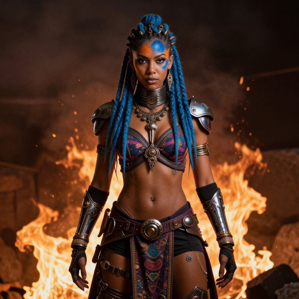 Photograph of a fierce, blue-haired warrior woman with dark skin, intricate armor, and tribal accessories, standing in front of a roaring fire.