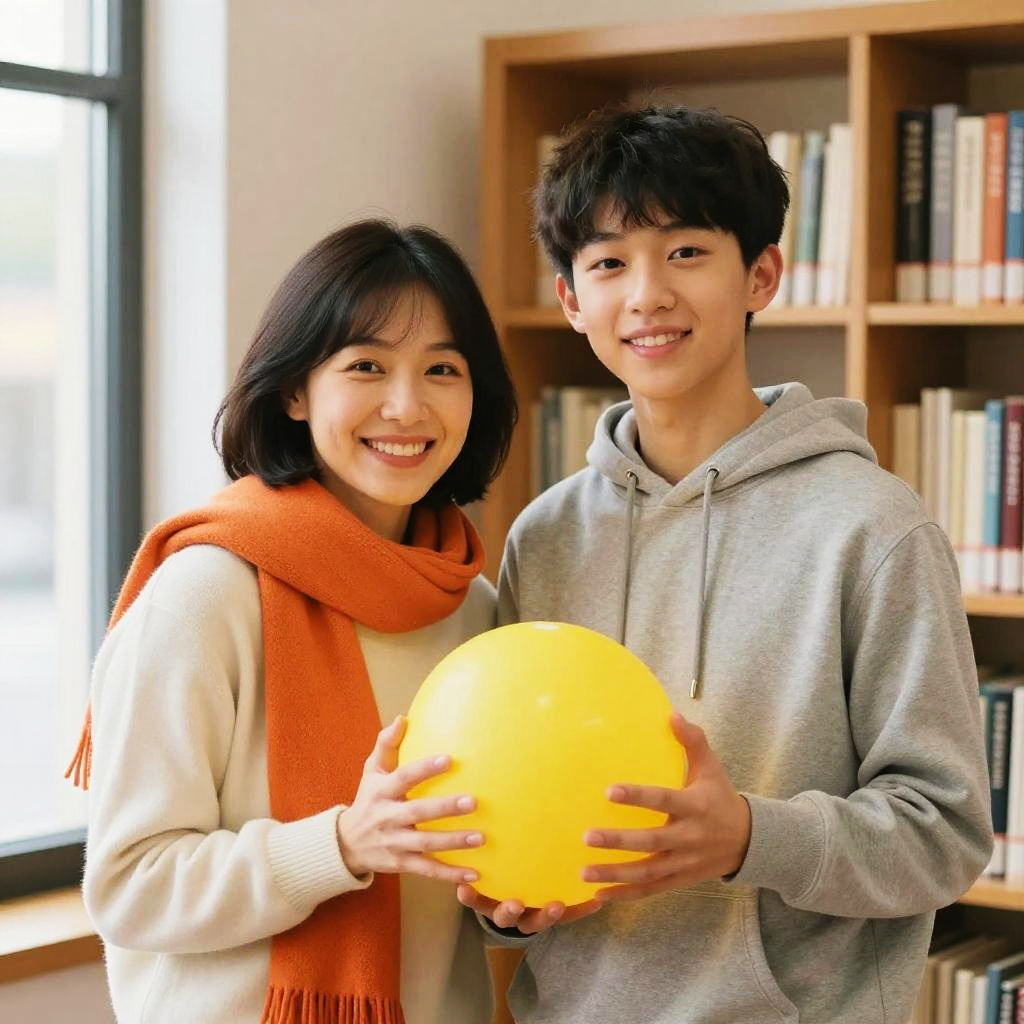 A woman with short black hair in an orange scarf and a teenage boy in a grey hoodie in a cozy library corner, depicted in warm digital portrait realism. They pose together holding a bright yellow ball, cheerful expressions, balanced composition, vibrant yet natural palette, soft key light from the left, gentle rim light, clean background, shallow depth of field, crisp edges, subtle grain or paper texture consistent with style, controlled highlights and shadows, playful family-friendly mood, high detail and professional finish.