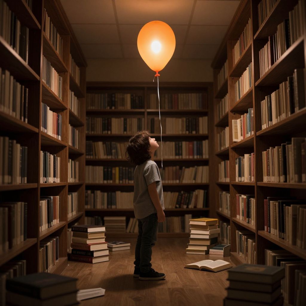 A solitary child stands in a dimly lit library, gazing up at a glowing orange balloon tethered to the ceiling, as scattered books on the floor seem to pulse with life, inviting exploration in a world where knowledge and wonder intertwine.