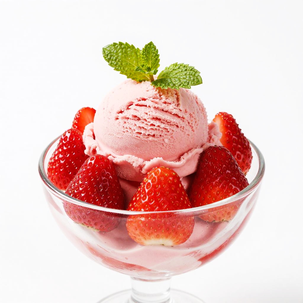 Photograph of a colorful dessert: a generous scoop of bright pink ice cream piled high in a clear glass bowl. The ice cream is garnished with two fresh green mint leaves and nestled among several juicy, red strawberries. The white background makes the pink and red colors pop, while the glass bowl adds a touch of elegance to the overall presentation.