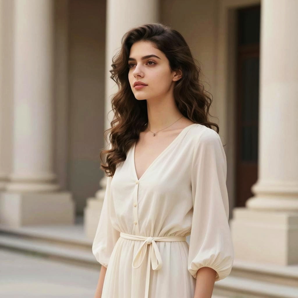 Woman in Sapphire Silk Blouse at Rooftop Bar