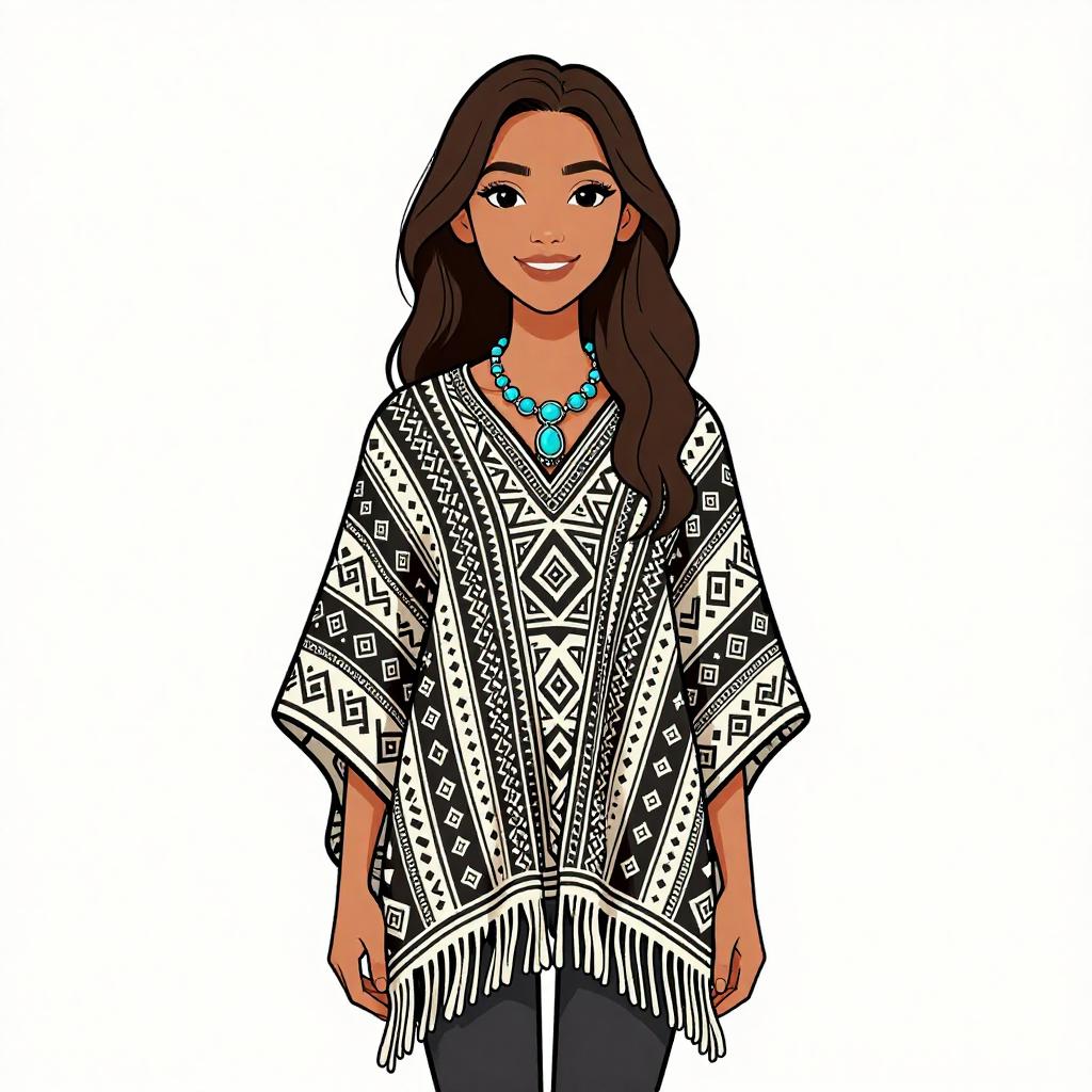 Woman with pretty face and pretty hair. smiling Woman, bohemian, black and white geometric print poncho, fringe detail at hem, oversized, draped fit, long-sleeved, paired with statement turquoise necklace. --sref 1467