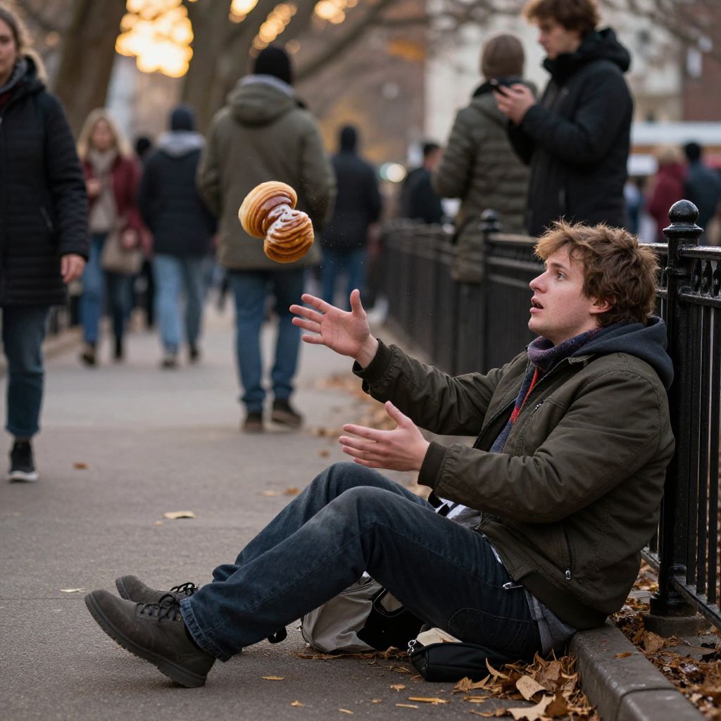 Photograph of a young man in a black jacket sitting on a city sidewalk, mid-air tossing five doughnuts, surrounded by blurred pedestrians in winter clothing