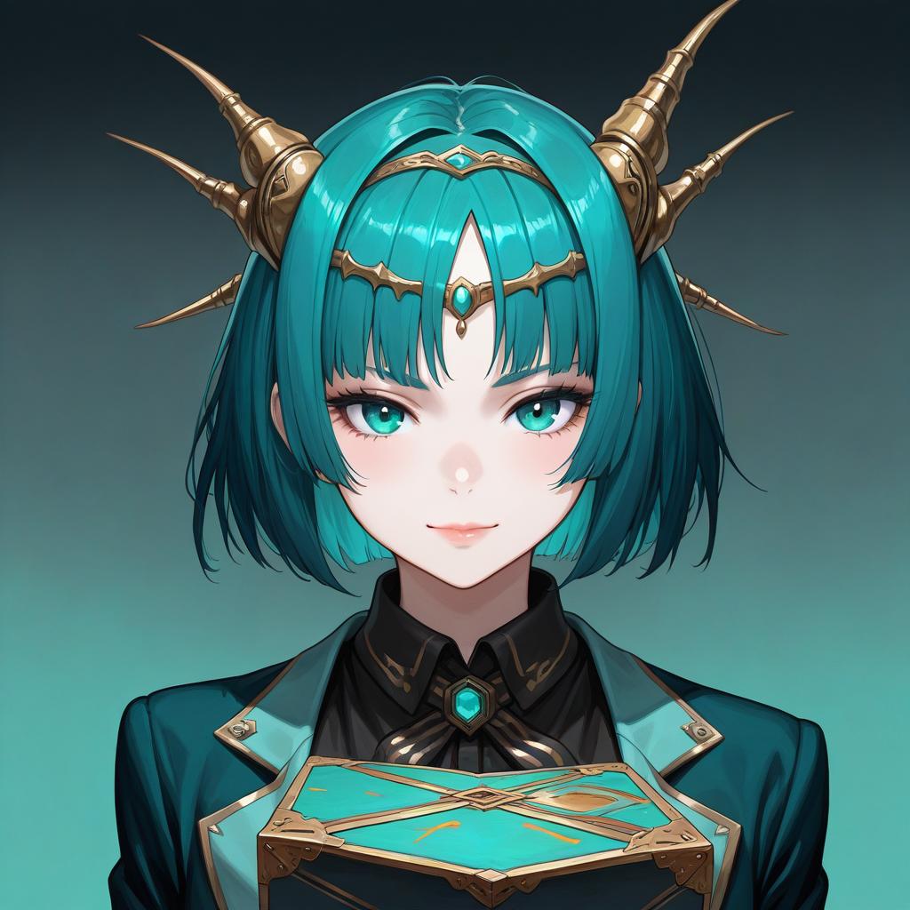 Digital artwork of a futuristic anime girl with teal box-cut hair wearing a teal blazer and a black shirt. She has a golden circlet with a turquoise gem on her forehead and metallic golden horn-like ornaments on her head. The background features a gradient contrasting from dark to teal tones, enhancing the focus on the subject.