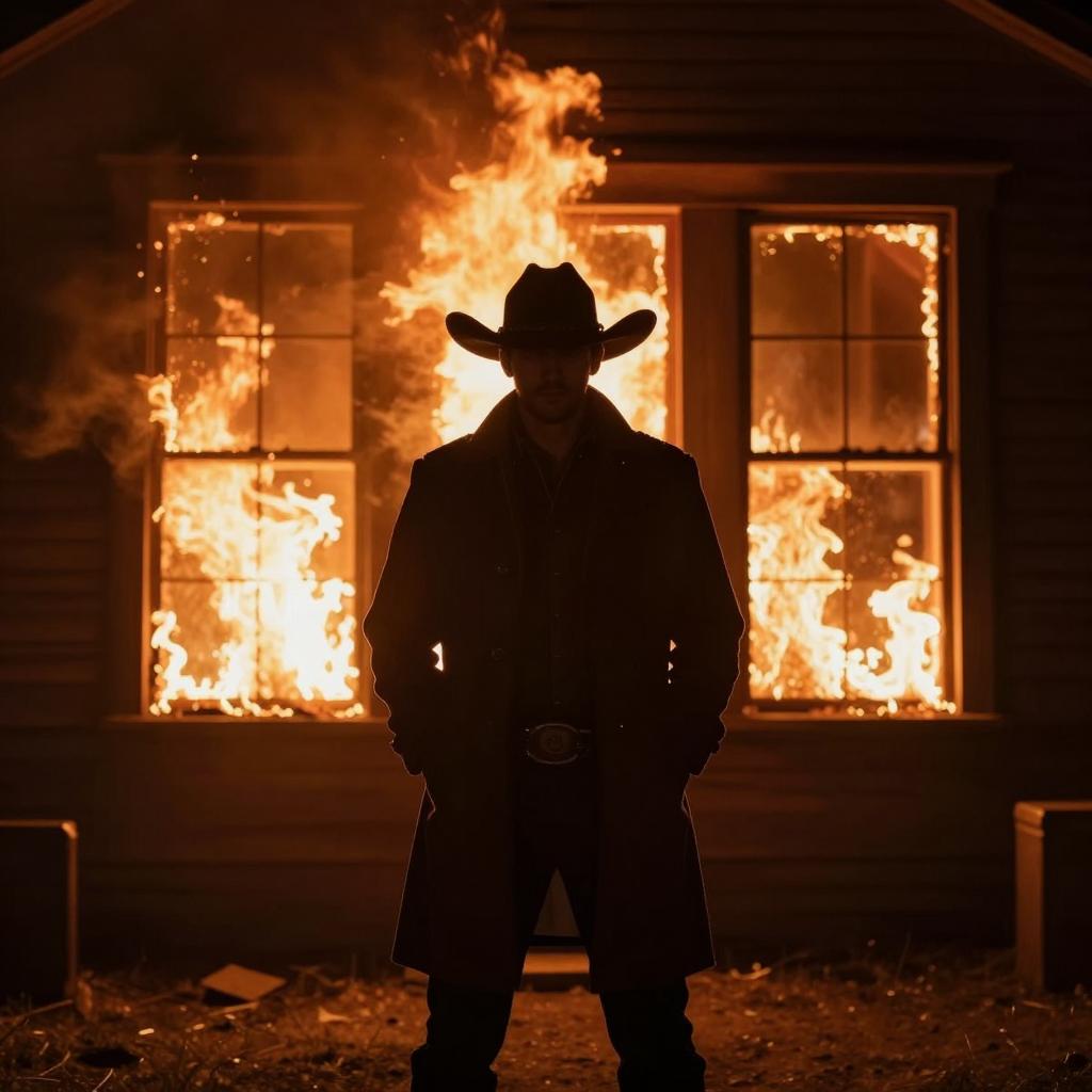 Silhouetted man in dark cowboy hat and long coat stands in front of burning wooden building with flames illuminating windows. Man's face is shadowed, hands in pockets. Firelight creates bright orange and yellow glow. Two large vertical windows on building, flames visible through glass. Dark, smoky background.