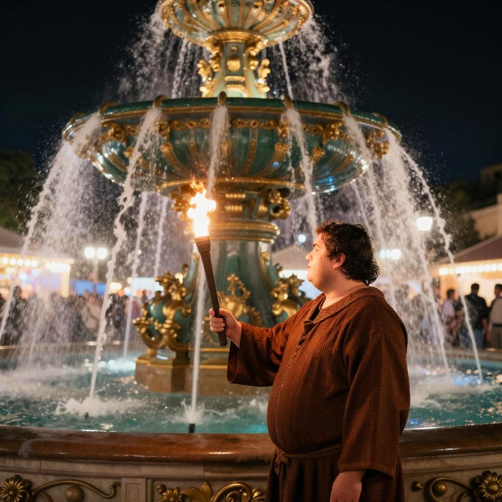 Photograph of a chubby man in a brown robe holding a torch, standing before an ornate, multi-tiered fountain with cascading water at night