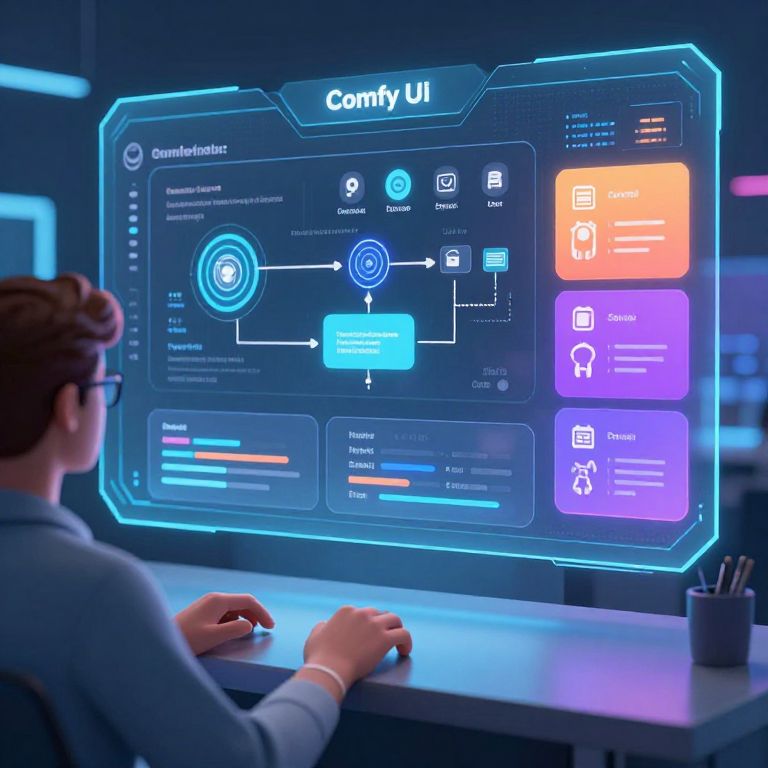 How to use Comfy UI: a high-tech command center with holographic displays and intuitive user interface elements, vibrant colors, and user-friendly icons, illustrating the flow of information and the simplicity of complex controls for advanced users.