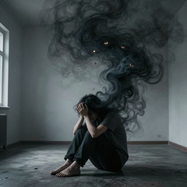 Photograph of a sad, disheveled person with dark, wavy, smoke-like tendrils emerging from their head, resembling a ghostly aura. They sit on a concrete floor in a dimly lit, empty room with white walls and a single window to the left. The person has dark hair, wears a black shirt and loose black pants, and is barefoot. Their head is bowed, hands covering their face, conveying deep sorrow or despair. The smoke tendrils, dark and swirling, have small, glowing red eyes scattered throughout. The overall mood is eerie and melancholic.