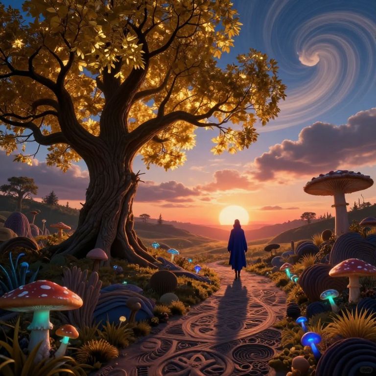 Envision an enchanting landscape where a majestic tree, its leaves shimmering like gold, stands out in the foreground. The branches stretch towards a sky of swirling clouds, reminiscent of velvet against a vivid background. From an insect's perspective, this scene reveals a mysterious figure cloaked in midnight blue wandering along a path lined with bioluminescent mushrooms, each emitting unique colors. As the sun sets, it casts elongated shadows over the intricate terrain, blending organic and geometric shapes to form an alluring mosaic that evokes both awe and curiosity, inviting viewers to explore this realm of surreal beauty and enigmatic discoveries.