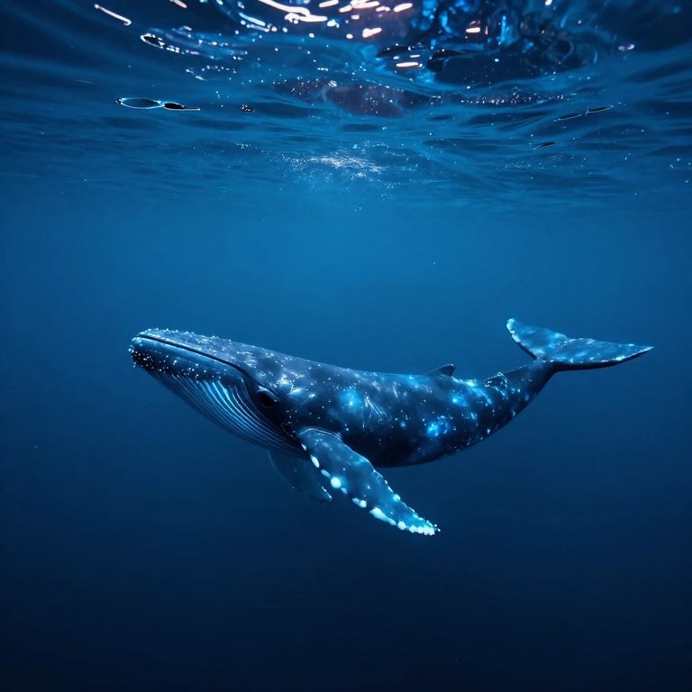 Whales with bioluminescent bodies glide gracefully through an inverted forest, their forms illuminated by ethereal blue lights as they navigate the serene, gravity-defying underwater landscape.