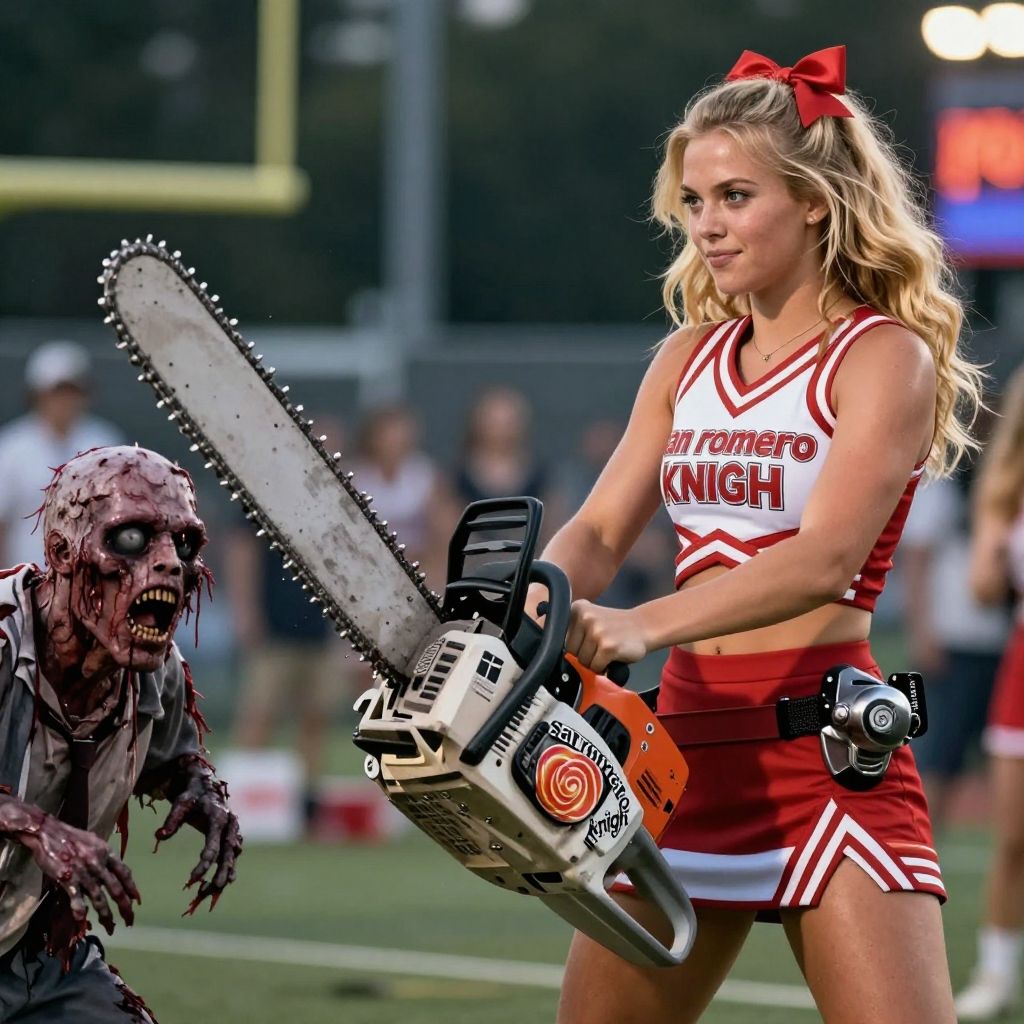 Photograph of a blonde cheerleader in red and white uniform wielding a chainsaw, facing a zombie on a football field.